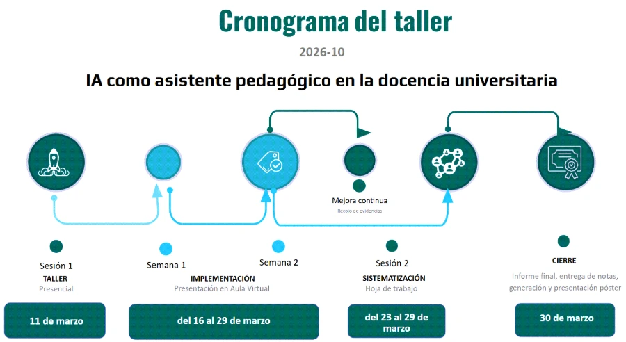 Al finalizar el taller, los docentes podrán integrar herramientas de IA como copiloto pedagógico para organizar, analizar y sintetizar contenidos educativos de manera inteligente, generando recursos y actividades interactivas de alta calidad, optimizando su tiempo y fortaleciendo la experiencia de aprendizaje de los estudiantes mediante un diseño educativo más eficiente y basado en múltiples fuentes de información.